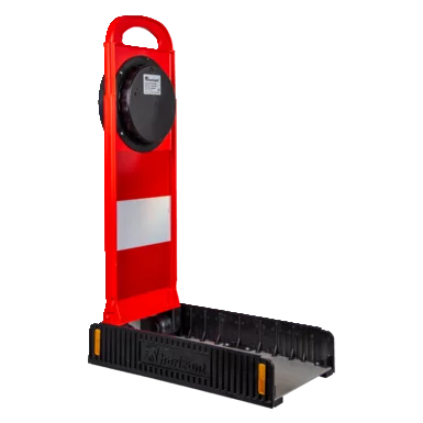 Stabiler Edelstahlfuss mit Kunststoffstapelschienen. Durch den neuen Fuss ist eine sichere Stapelbarkeit bei mehreren FlashMax Leuchten übereinander gewährleistet. Zusätliche Anti-Rutsch-Noppen bieten einen sicheren Stand auf glatten Flächen und erhöhen nochmals die Standsicherheit bei vorbei fahrenden Fahrzeugen.