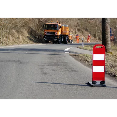 Der horizont Warnmax zeigt das Folienbild der bewährten Leitbaken in einer reduzierten Version. Bei dem Warnmax P von horizont kommt ein quergestreiftes Folienbild zum Einsatz, damit kann z.B. eine Unfallstelle besonders schnell gesichert werden, da bei der Aufstellung nicht auf die Umfahrungsrichtung geachtet werden muss. Deutlich bessere Reflexion durch Einsatz von Folie der Reflexionsklasse RA 2 C. - einseitig beklebt! -