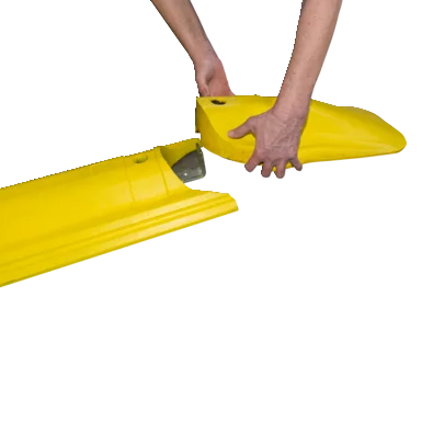 Das abgeschrägte Endstück B für Leitschwellen, in gelb, enthält eine Sicherungsschraube. Es ist wie die Leitschwelle selbst aus Recyclingmaterial und mit dem Anti-Rutsch System ARS ausgestattet.